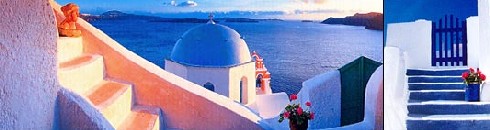 valkoiset talot, siniset kirkon kupolit ja kirkkaan pastellinsävyiset ovet ja kukkaruukut saavat sielun huokaisemaan